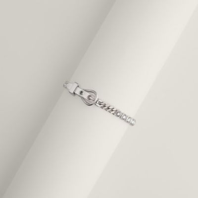 Celebration of the House's origins, the equestrian jewelry collection transposes the universe of harnesses into delicate jewels. Stirrups, bits, galloping heads, and Filet d'Or links are stylized to embrace the body with finesse. Find this elegance of movement in our [gold jewelry], true luminous sculptures, or affirm a rawer equestrian allure with our [silver jewelry]. The ultimate homage to Hermès' first client: the horse.