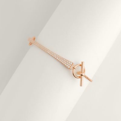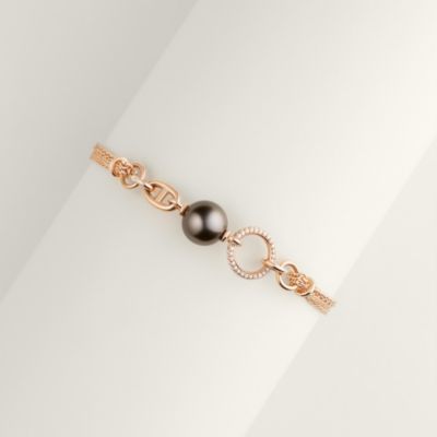 Adornment of character, the Hermès gold bracelet sublimes your movements and affirms a radical aesthetic. Each creation is an alchemy between the rigor of design and the sensuality of material, reinventing the House's iconic chains and clasps. Let yourself be captivated by the mineral radiance and incisive purity of our [white gold bracelets], true streaks of light on the skin. Explore the intimacy of a warmer shade with our [rose gold bracelets], whose coppery reflections envelop the wrist in a sophisticated aura. Finally, celebrate the solar and vibrant heritage of jewelry with our [yellow gold bracelets], sparkling tributes to the art of the link.