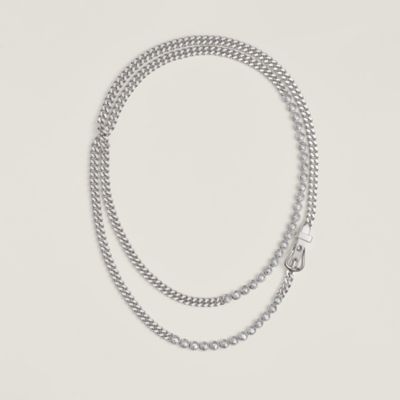 Affirmation of style, Hermès men's jewelry explores the tension between raw materials and architectural design. Silver, leather, and gold unite to create pieces with assumed masculinity, where function inspires form. Discover the modern purity and radical graphics of our [white gold wedding rings], discreet symbols of an eternal attachment. Elegance is also played out in functional details: our [cufflinks] revisit saddle studs or motifs from the Ex-Libris collection to sublime the shirt with wit. The iconic Chaîne d'ancre link, inspired by the marine universe, structures many of our [bracelets], whether braided with Tournis leather or sculpted in solid metal. This graphic strength is also worn as a long necklace: explore our [necklaces] with assertive volumes, and let yourself be captivated by the mineral and sophisticated radiance of our [white gold necklaces], touches of cold light on the silhouette.