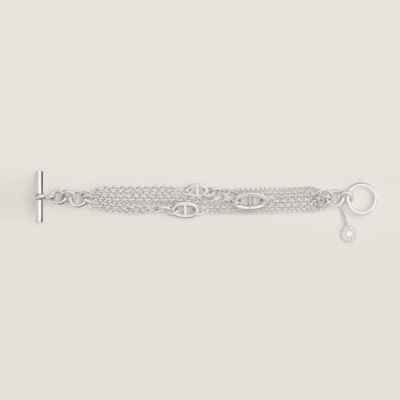 The Hermès silver bracelet celebrates the beauty of the link and the fluidity of white metal. Adornment of character, it wraps around the wrist with raw elegance. Let yourself be seduced by the iconic [Chaîne d'ancre collection], declining its naval motif in supple chains or sculptural [cuffs]. Heritage is also expressed via the signature clasps of the Kelly line or the rock volumes of the Collier de Chien. Solid silver creations that combine exceptional savoir-faire and radical design.