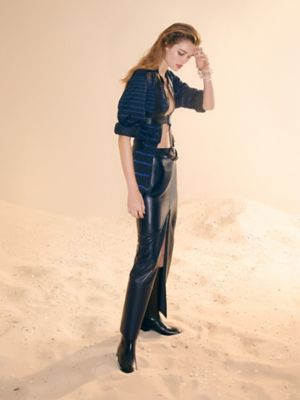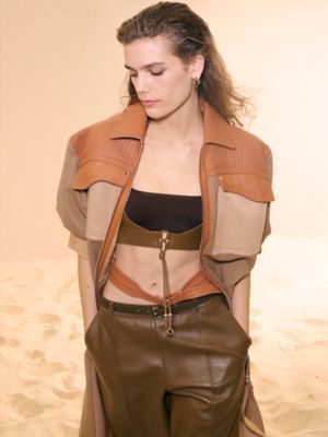 Der Look wird feiner, der Horizont zeichnet sich ab, Leder gleitet über die Haut. Strick und Volumina wecken Erinnerungen an das Meer, die Bewegungen der Wellen werden von den Silhouetten widergespiegelt. Die Reiterin setzt ihre Reise fort.