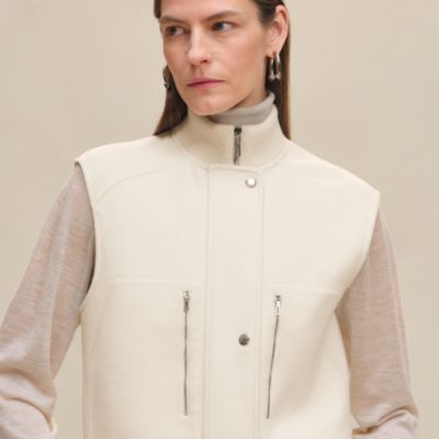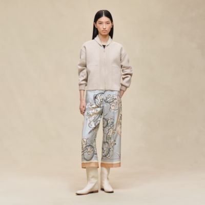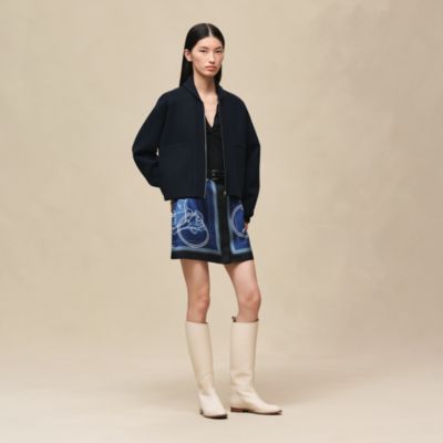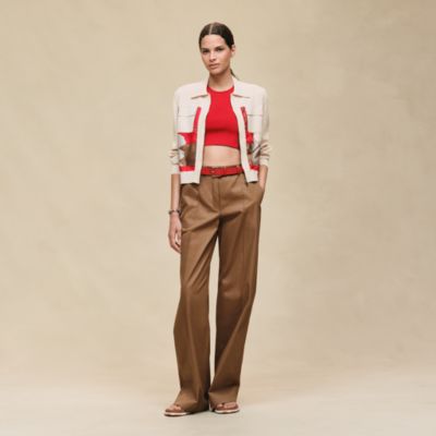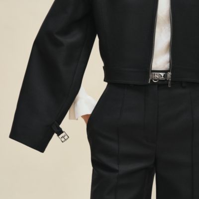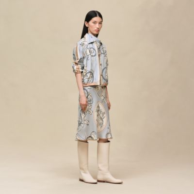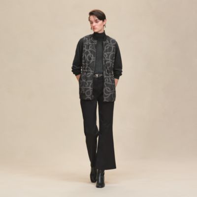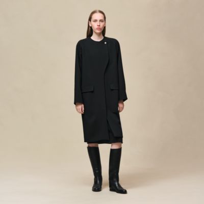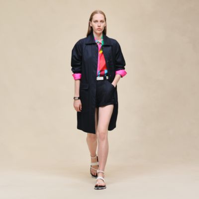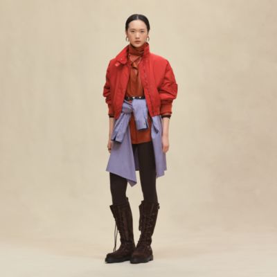 Mäntel aus Doubleface-Kaschmir, warme Daunenjacken aus Toile Plume, Trenchcoats aus technischen Materialien, Jacken aus Leder mit sportlich-geradem Schnitt oder mit körpernahem, von der Reitsportwelt inspiriertem Design: Die Damengarderobe setzt auf das Spiel mit Kontrasten und präsentiert sich als dynamische Hommage an das Erbe der Maison.