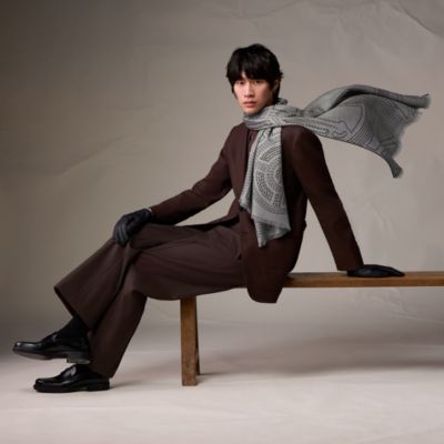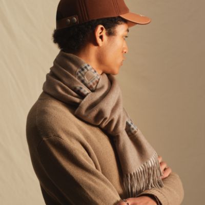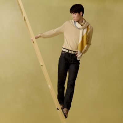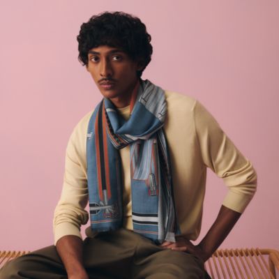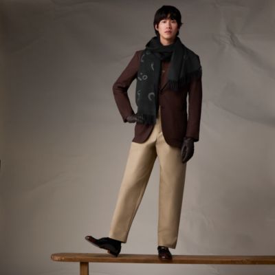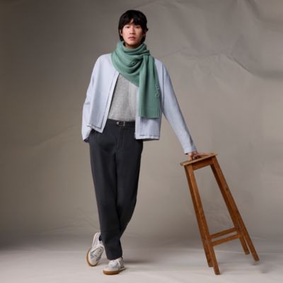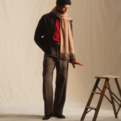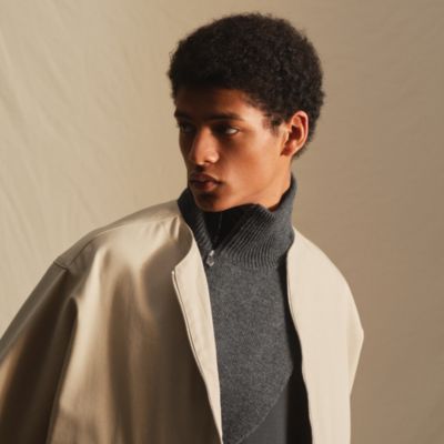 Essentiell und beherrscht, vervollständigt der Strick den Look in einer modernen Collage von Texturen.