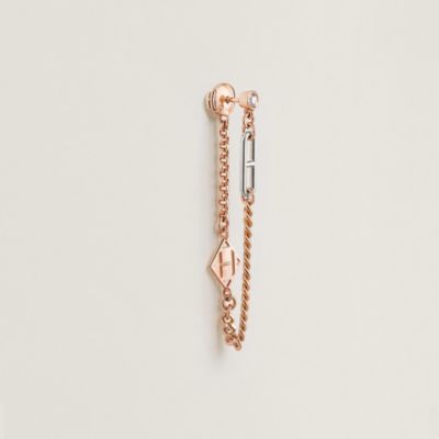 True points of light, the Hermès earring collection sculpts the face and sublimes the carriage of the head. Each creation plays with volumes and reflections of precious metal to affirm a radiant femininity. Reveal the solar and statutory radiance of the face with our [yellow gold earrings], or prefer the caressing and sophisticated nuance of our [rose gold earrings], which blend delicately with the complexion. The House's stylistic boldness is also expressed through new ways of wearing: explore our [ear jewelry], architectural creations designed to dress the lobe or cartilage with freedom. Finally, let yourself be tempted by the poetic singularity of our [rose gold ear jewelry], for a resolutely contemporary touch of asymmetry.
