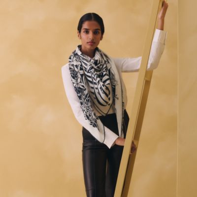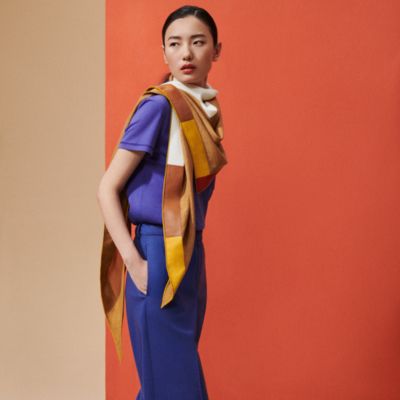 色鮮やかで軽やかなエルメスのシルクスカーフは、五感に語りかける世界への扉。メゾンを象徴するシルクカレをスカーフリングに通したり、ゆったりとした大判のショールを思いつくままのかたちに結んだり。色とりどりのレクタングルやシルクバンダナを巻いて首元や髪を飾ったり。軽やかに個性を表現する方法は無限に広がります。