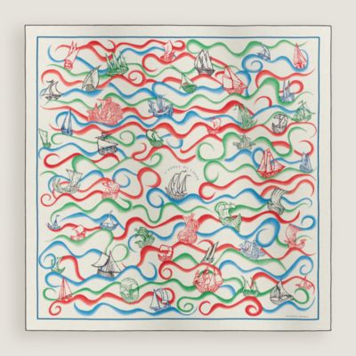海原のようなシルクのドレープ、その軌跡でプリントの絵柄がゆらめく。