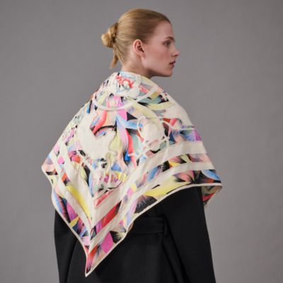 色鮮やかで軽やかなエルメスのシルクスカーフは、五感に語りかける世界への扉。メゾンを象徴するシルクカレをスカーフリングに通したり、ゆったりとした大判のショールを思いつくままのかたちに結んだり。色とりどりのレクタングルやシルクバンダナを巻いて首元や髪を飾ったり。軽やかに個性を表現する方法は無限に広がります。