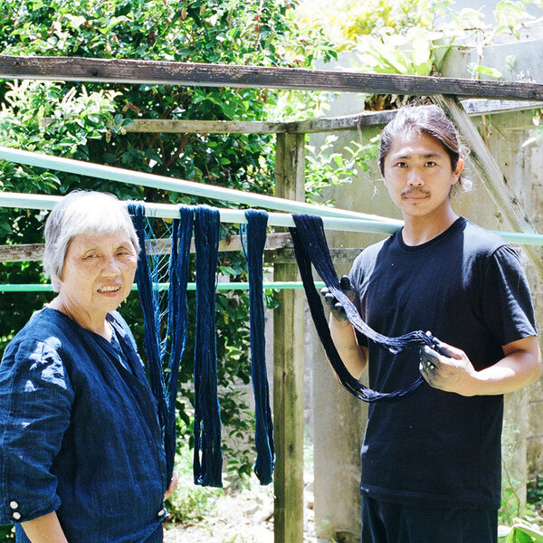 新城 大地郎×砂川美恵子(染色家) 新城大地郎さんの旅の目的地である砂川美恵子さんの工房〈想思樹〉。そこで新城さんは、砂川さんに教えてもらいながら、実際に藍を抽出し、染める工程を体験していきました。