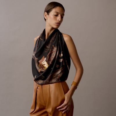 Delve into the colorful, ethereal and sensory world of Hermès scarves. Countless ways to style: The Maison's emblematic silk scarves are best accessorized using scarf rings, while larger Hermès shawls can be knotted to reflect your creativity. Whether draped around your neck or tied in your hair, glistening rectangle silk scarves and Hermès bandanas offer infinite possibilities to express your style with a touch of effortless elegance.