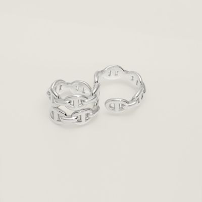 Sculptures of light, Hermès silver rings dress the hand with architectural boldness. Solid silver, the House's material of choice, morphs to revisit our historical codes. Find the iconic marine link through our rings from the [Chaîne d'ancre] collections, or prefer the contemporary and clean lines of the Osmose collection. Each creation plays on volumes, full and empty spaces, offering a timeless style signature and unique lunar brilliance.