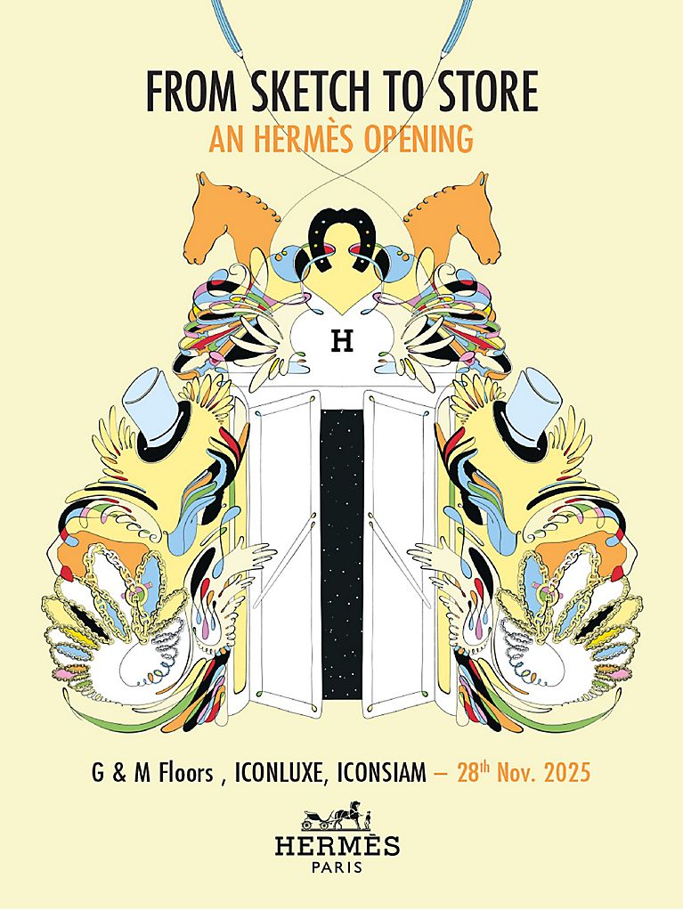 On the banks of the Chao Phraya River, Hermès reopens its store at ICONSIAM, presenting a luminous new space that celebrates the city’s vibrancy and the maison’s craftsmanship. Originally inaugurated in 2018, the store now returns with expanded volumes and refreshed design, guiding visitors through sixteen métiers. From the pink marble ex libris at the entrance to rattan columns crafted by local artisans, every detail reflects a dialogue between art, craft, and place.