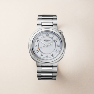 Discover Hermès Time, a singular vision of time combining whimsy and rigor. Explore our collections of [women's watches], where elegance is adorned with precious materials and deep [black] dials. Watchmaking ingenuity is also expressed in our [men's watches], animated by the precision of [quartz] or poetic complications like the [moon phase]. From the sporty lines of the [Hermès Cut] to padlocked icons like the [Kelly], each timepiece reflects our savoir-faire. Finally, personalize your style thanks to our interchangeable [straps].