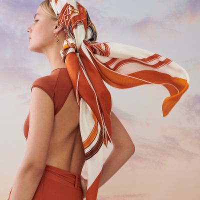 Delve into the colorful, ethereal and sensory world of Hermès scarves. Countless ways to style: The Maison's emblematic silk scarves are best accessorized using scarf rings, while larger Hermès shawls can be knotted to reflect your creativity. Whether draped around your neck or tied in your hair, glistening rectangle silk scarves and Hermès bandanas offer infinite possibilities to express your style with a touch of effortless elegance.