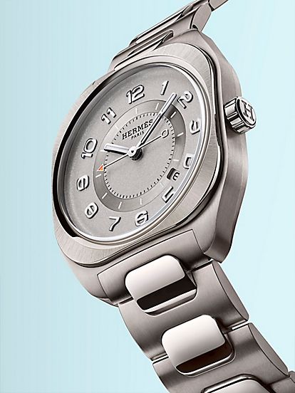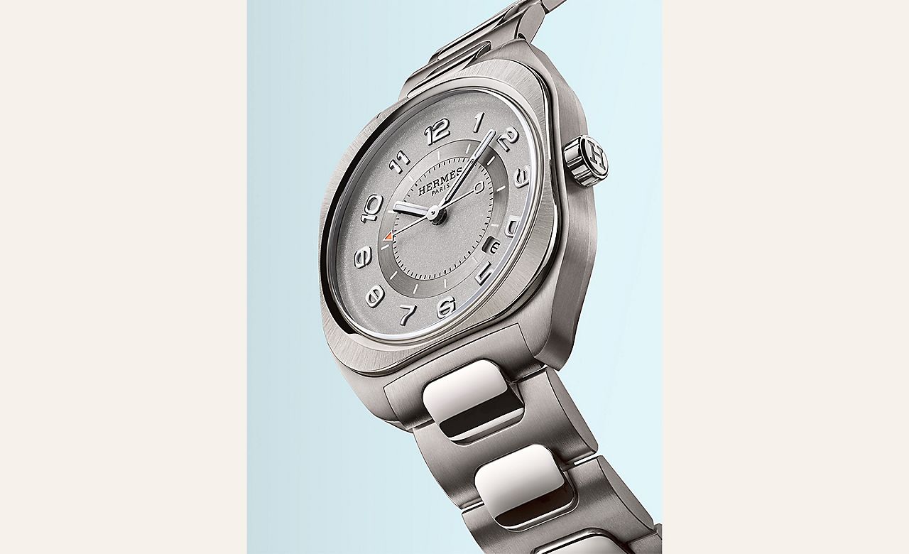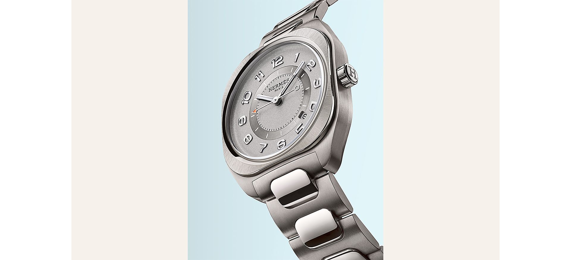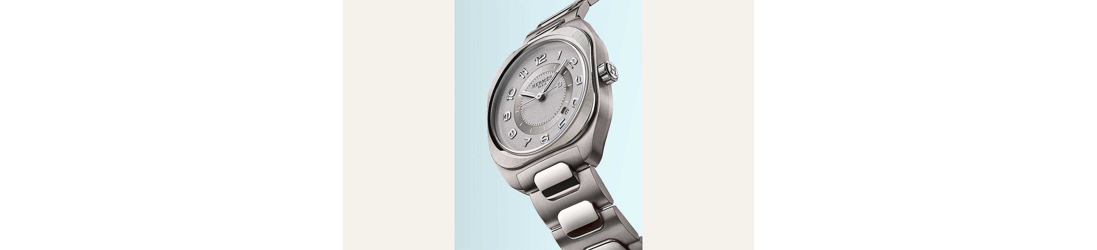 Powered by the Manufacture Hermès H1837 self-winding movement, the collection welcomes two new titanium versions with grained light-coloured dials displaying hours, minutes and seconds. These original interpretations accentuate the audacity present in the font of the dial’s luminescent Arabic numerals along with the singular design of each detail, all the way to the date aperture at 4:30.